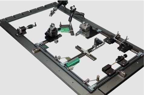 Schnittstelle zwischen Maschinentisch und Fixiersystem. Verzahnte Grundschienen und Anschlussschienen zur optimalen Durchlichtmessung.